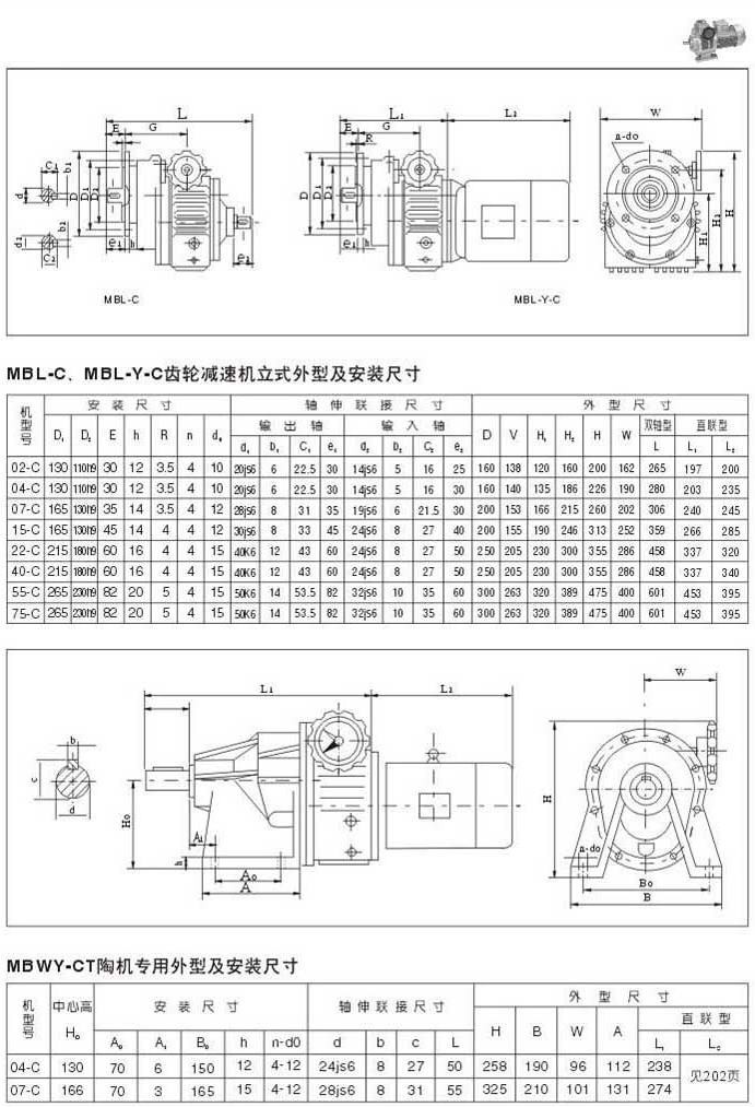 MBL-C,MBL-Y=C齒輪減速機(jī)的臥式外型及安裝尺寸MBWY-CT陶機(jī)專用外型及安裝尺寸